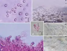 Suivant les auteurs, les lames comportent ou pas des pleurocystides clavées ou globuleuses 15 à 30 µm de long pour 10 à 20 µm de large. La cuticule est formée d'hyphes cloisonnées et non bouclées, couchées plus ou moins parallèles qui mesurent de 1,5 à 4 µm de large. Sa couche superficielle est enrobée dans une masse gélatineuse incolore alors que celles du dessous sont faiblement pigmentées. Le voile situé au bas du pied est composé de nombreux sphérocystides[5],[13],[8],[2],[9].