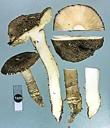 Cette Saproamanite présente un chapeau sombre gris-brun squamuleux d'aspect laineux fortement ourlé. Les lamelles sont blanches virant au saumon abricoté avec l'âge, et rosissant nettement à la dessication. Le pied présente un anneau gris au bord étroit noir, s'évase en massue fusoïde sans montrer de volve évidente dans sa partie inférieure. Gris sombre dans sa partie supérieure, l'inférieure est couverte de fines fibrilles noires recourbées semblables à des poils sur un fond couleur saumon sale ou fauve vif. Bien enterré, il est atténué en pointe sous le collet. La chair est généralement blanche, jaunâtre dans la partie basse du pied et rosissante après quelques minutes d'exposition à l'air libre[1],[4],[7].