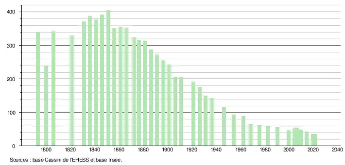 L'évolution du nombre d'habitants est connue à travers les recensements de la population effectués dans la commune depuis 1793. Pour les communes de moins de 10 000 habitants, une enquête de recensement portant sur toute la population est réalisée tous les cinq ans, les populations légales des années intermédiaires étant quant à elles estimées par interpolation ou extrapolation[16]. Pour la commune, le premier recensement exhaustif entrant dans le cadre du nouveau dispositif a été réalisé en 2004[17].