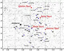 | Ain | ε Tau | 3,54 | 155 | G9.5III | une exoplanète possible |