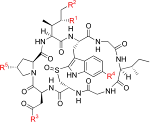 | Amaninamide | OH | OH | NH2 | H | OH | Dihyile–Trp–Gly–Ile–Gly–Cys–Asn–Hypro | |