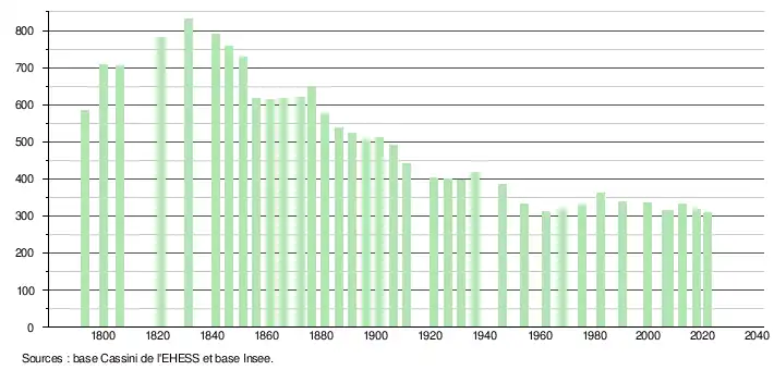 L'évolution du nombre d'habitants est connue à travers les recensements de la population effectués dans la commune depuis 1793. Pour les communes de moins de 10 000 habitants, une enquête de recensement portant sur toute la population est réalisée tous les cinq ans, les populations légales des années intermédiaires étant quant à elles estimées par interpolation ou extrapolation[43]. Pour la commune, le premier recensement exhaustif entrant dans le cadre du nouveau dispositif a été réalisé en 2007[44].