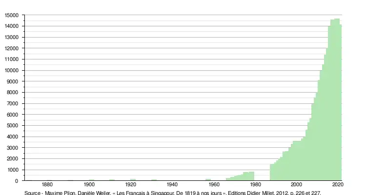 Le nombre de Français enregistrés auprès de l'ambassade à Singapour a connu une progression importante depuis le milieu des années 2000. Au , 13 952 Français sont inscrits sur le registre consulaire à Singapour[8].