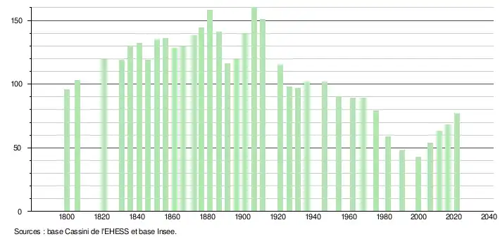 L'évolution du nombre d'habitants est connue à travers les recensements de la population effectués dans la commune depuis 1800. Pour les communes de moins de 10 000 habitants, une enquête de recensement portant sur toute la population est réalisée tous les cinq ans, les populations légales des années intermédiaires étant quant à elles estimées par interpolation ou extrapolation[7]. Pour la commune, le premier recensement exhaustif entrant dans le cadre du nouveau dispositif a été réalisé en 2006[8].