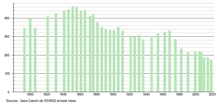L'évolution du nombre d'habitants est connue à travers les recensements de la population effectués dans la commune depuis 1793. Pour les communes de moins de 10 000 habitants, une enquête de recensement portant sur toute la population est réalisée tous les cinq ans, les populations légales des années intermédiaires étant quant à elles estimées par interpolation ou extrapolation[24]. Pour la commune, le premier recensement exhaustif entrant dans le cadre du nouveau dispositif a été réalisé en 2004[25].