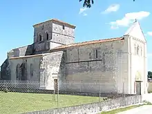 Le clocher rectangulaire a au premier étage, ses faces percées de deux baies. Le second étage est percé d'une baie rectangulaire, est surmontée d'une corniche, et d'un toit bas à quatre pans.