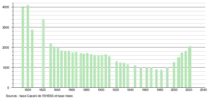 L'évolution du nombre d'habitants est connue à travers les recensements de la population effectués dans la commune depuis 1793. Pour les communes de moins de 10 000 habitants, une enquête de recensement portant sur toute la population est réalisée tous les cinq ans, les populations légales des années intermédiaires étant quant à elles estimées par interpolation ou extrapolation[21]. Pour la commune, le premier recensement exhaustif entrant dans le cadre du nouveau dispositif a été réalisé en 2005[22].