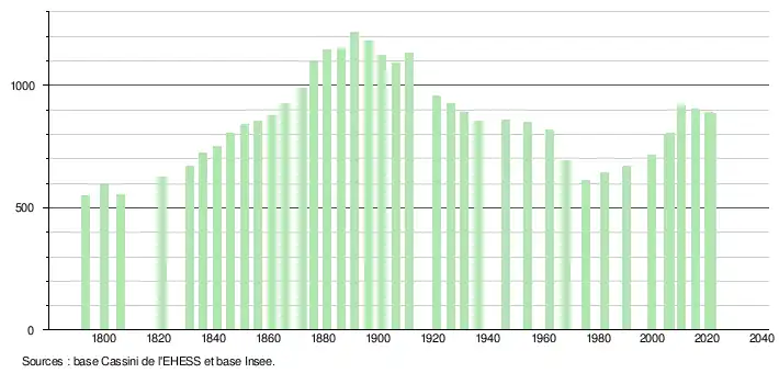 L'évolution du nombre d'habitants est connue à travers les recensements de la population effectués dans la commune depuis 1793. Pour les communes de moins de 10 000 habitants, une enquête de recensement portant sur toute la population est réalisée tous les cinq ans, les populations légales des années intermédiaires étant quant à elles estimées par interpolation ou extrapolation[35]. Pour la commune, le premier recensement exhaustif entrant dans le cadre du nouveau dispositif a été réalisé en 2005[36].