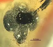 Vue de dos du spécimen holotype MNHN A30088 Gerontoformica cretacica dans l'ambre charentais datant d'environ 100 Ma | |||||