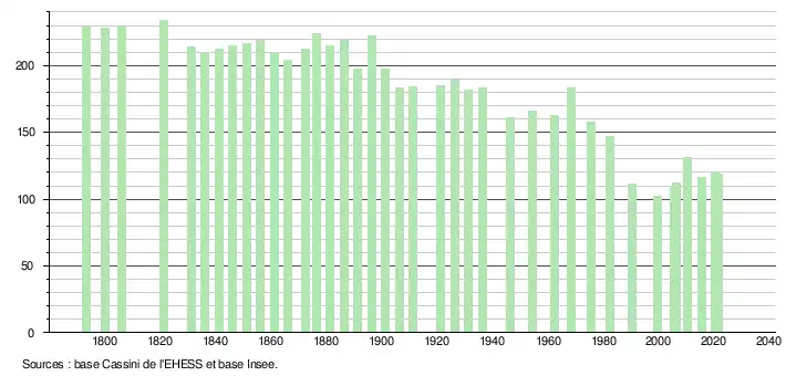L'évolution du nombre d'habitants est connue à travers les recensements de la population effectués dans la commune depuis 1793. Pour les communes de moins de 10 000 habitants, une enquête de recensement portant sur toute la population est réalisée tous les cinq ans, les populations légales des années intermédiaires étant quant à elles estimées par interpolation ou extrapolation[32]. Pour la commune, le premier recensement exhaustif entrant dans le cadre du nouveau dispositif a été réalisé en 2005[33].