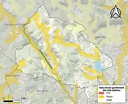 Le retrait-gonflement des sols argileux est susceptible d'engendrer des dommages importants aux bâtiments en cas d’alternance de périodes de sécheresse et de pluie. 23,4 % de la superficie communale est en aléa moyen ou fort (26,8 % au niveau départemental et 48,5 % au niveau national). Sur les 221 bâtiments dénombrés sur la commune en 2019, 32 sont en aléa moyen ou fort, soit 14 %, à comparer aux 36 % au niveau départemental et 54 % au niveau national. Une cartographie de l'exposition du territoire national au retrait gonflement des sols argileux est disponible sur le site du BRGM[18],[Carte 2].
