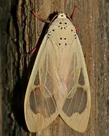 La tête, le thorax, la base de l'abdomen et de sa partie antérieure sont jaune brunâtre[3] à ocre pâle[5] ou jaune ocre[1]. La base des antennes est vermillon avec une fine tache noire. Le dos et les côtés des palpes sont rouge carmin brillant avec une tache noire sur l'extérieur de la base. Le centre et l'extrémité sont à moitié noirs[1]. Un point noir est présent au milieu du front et de la crête. Le collier arbore des points semblables sur les coins avant. Six de ces points sont présents sur le bord antérieur du thorax avec un point de chaque côté de l'épaule. Les points les plus externes ne sont pas visibles de dessus. En avant du milieu du bord postérieur du thorax, quatre de ces points forment un carré[1].