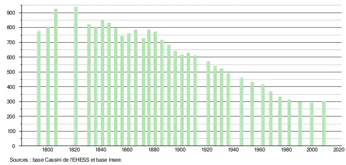 - Dans le tableau des recensements et le graphique, par convention dans Wikipédia, le principe a été retenu, pour les populations légales postérieures à 1999 de n’afficher dans le tableau des recensements et le graphique que les populations correspondant à l'année 2006, première population légale publiée calculée conformément aux concepts définis dans le décret no 2003-485 du 5 juin 2003, et les années correspondant à une enquête exhaustive de recensement pour les communes de moins de 10 000 habitants, ainsi que la dernière population légale publiée par l’Insee.