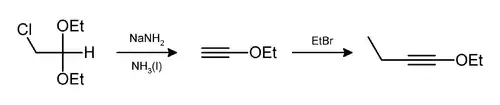 Du chlorure d'hydrogène (HCl) et/ou de l'éthanol (C2H5OH) peuvent aussi être éliminés de la même façon[9] comme dans la préparation du 1-éthoxy-but-1-yne[10]: