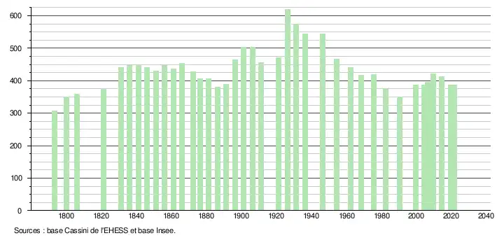 L'évolution du nombre d'habitants est connue à travers les recensements de la population effectués dans la commune depuis 1793. Pour les communes de moins de 10 000 habitants, une enquête de recensement portant sur toute la population est réalisée tous les cinq ans, les populations légales des années intermédiaires étant quant à elles estimées par interpolation ou extrapolation[20]. Pour la commune, le premier recensement exhaustif entrant dans le cadre du nouveau dispositif a été réalisé en 2004[21].