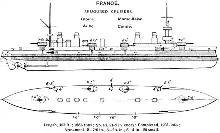 Le croiseur cuirassé Amiral Aube fait partie d'une série de navires dits classe Dupleix, de dimensions plus modestes que ceux de la classe Gloire, mais considérés au tout début du XXe siècle comme plus adaptés aux exigences des guerres maritimes modernes[3].