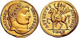 Après la défaite de Licinius au milieu de l'année 324, Constantin augmenta la production dans les hôtels des monnaies de l'Est afin de payer les coûts de ses dépenses accrues. L'augmentation rapide du nombre de pièces a entraîné de fréquentes variations des marques de frappe et de la légende du revers, d'où le profil de Constantin frappé sur la pièce