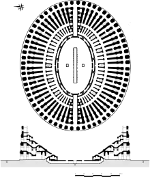La forme générale de l'édifice est celle d'une ellipse dont les axes mesurent 148 et 122 mètres ; les axes de l'arène mesurent respectivement 65 et 39 mètres[45], son périmètre se monte à 427 mètres[8]. La construction avait une hauteur de 36 mètres[49].