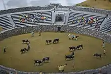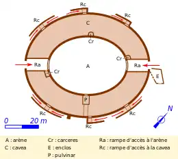 Au nord-est, un enclos, peut-être un parc destiné aux bestiaux exhibés lors des jeux, jouxte la rampe d'accès à l'arène[10]. Deux carceres, loges dans lesquelles des prisonniers attendent le moment de combattre dans l'arène, sont aménagés le long de ces mêmes rampes ; un troisième est placé sous le pulvinar[6].
