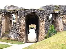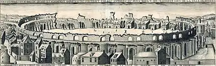 Au Moyen Âge, l'amphithéâtre de Poitiers porte le nom « d'arènes de Poitiers » par synecdoque[N 1] ou, au même titre que ceux de Bordeaux ou de Saintes, de « Palais Gallien »[9]. Au moins dès le XIVe siècle, l'emplacement de l'amphithéâtre, encore imposant, est occupé par diverses habitations et des jardins particuliers[10]. Des écrits du témoignent de la subsistance, à cette époque, de nombreuses arcades et voûtes[11]. En 1757, trois arcades sont mentionnées par les religieux de l'abbaye de Noaillé[12].