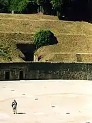 Son arène mesurait 75 mètres de long pour 50 mètres de large, et 25 000 à 30 000 spectateurs pouvaient trouver place dans l'amphithéâtre, ce qui le situait parmi les dix plus grands amphithéâtres romains. Les gradins se constituaient de trois rangées de vingt-quatre rangs de spectateurs. À l'intérieur du mur, 14 petits locaux étaient creusés, vraisemblablement pour les cages des animaux. Sous l'arène, s'étendait un sous-sol où l'on trouvait la machinerie commandant les ascenseurs ainsi que la montée ou la descente des plateaux. Le sous-sol, aujourd'hui dégagé, est accessible.