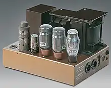 Le premier amplificateur électronique fut réalisé en 1906 par l’inventeur américain Lee De Forest à l’aide d'une triode[5]. La triode fut vite perfectionnée par l’ajout d’une (pour la tétrode) puis de deux grilles supplémentaires, palliant certains effets indésirables, notamment l’effet « dynatron » (zone où le tube présente une résistance négative). Ce tube pentode est ensuite rapidement adopté pour la plupart des amplificateurs à tubes, pour son meilleur rendement. Les amplificateurs à tubes sont aussi connus sous le nom d’amplificateurs à « lampes », en raison de la forme des tubes et de la lumière qu’ils émettent lorsqu’ils fonctionnent.