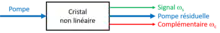 Dans la génération paramétrique optique, une onde pompe, de pulsation optique ωp, est incidente dans un cristal non linéaire. Au passage de l'onde pompe dans le cristal non linéaire, deux ondes de pulsations optiques inférieures ωs et ωc sont générées, avec la condition ωp=ωs+ωc. Ces deux ondes de basse pulsations optiques inférieures à ωp sont appelées respectivement "onde signal" et " onde complémentaire". L'onde pompe n'étant pas totalement convertie aux ondes signal et complémentaire, les trois ondes sont présents à la sortie du cristal [1].
