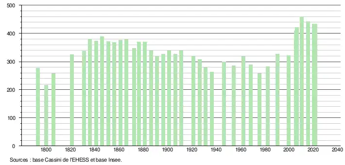 L'évolution du nombre d'habitants est connue à travers les recensements de la population effectués dans la commune depuis 1793. Pour les communes de moins de 10 000 habitants, une enquête de recensement portant sur toute la population est réalisée tous les cinq ans, les populations légales des années intermédiaires étant quant à elles estimées par interpolation ou extrapolation[20]. Pour la commune, le premier recensement exhaustif entrant dans le cadre du nouveau dispositif a été réalisé en 2005[21].