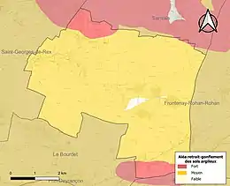 Les mouvements de terrains susceptibles de se produire sur la commune sont des tassements différentiels[17]. Le retrait-gonflement des sols argileux est susceptible d'engendrer des dommages importants aux bâtiments en cas d’alternance de périodes de sécheresse et de pluie[18]. 99,2 % de la superficie communale est en aléa moyen ou fort (54,9 % au niveau départemental et 48,5 % au niveau national)[Carte 2]. Depuis le , en application de la loi ELAN, différentes contraintes s'imposent aux vendeurs, maîtres d'ouvrages ou constructeurs de biens situés dans une zone classée en aléa moyen ou fort[Note 3],[19].