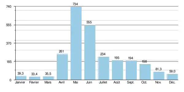Le débit moyen mensuel observé en février (minimum d'étiage) est de 33,4 m3/s, soit plus ou moins 4,5 % du débit moyen du mois de juillet (734 m3/s), ce qui témoigne de l'amplitude importante des variations saisonnières. Sur la durée d'observation de 43 ans, le débit mensuel minimal a été de 22 m3/s en , tandis que le débit mensuel maximal s'élevait à 1 500 m3/s en .