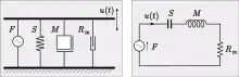 La figure montre un agencement mécanique d'une plate-forme de masse qui est suspendu au-dessus du substrat par un ressort de raideur et un amortisseur de résistance Le circuit équivalent d'analogie d'impédance est représenté à droite de cet arrangement et se compose d'un circuit résonnant en série. Ce système a une fréquence de résonance, et peut avoir une fréquence naturelle d'oscillation s'il n'est pas trop fortement amorti[16].