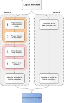 Avant de créer les signatures pour les maliciels nouvellement arrivés, ceux-ci doivent être analysés afin de comprendre les risques et les intentions associés. Le programme malveillant et ses capacités peuvent être observés soit en examinant son code ou en l'exécutant dans un environnement sûr[2].