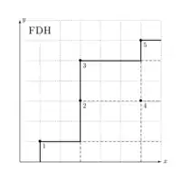 Mathématiquement, pour chacune des DMU, dont le couple d'input/output est , l'hypothèse FDH implique que les points produisant moins avec plus, où et appartiennent tous à l'estimation du technology set.