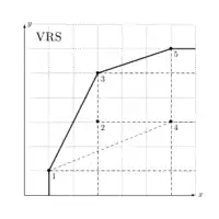 Cela se comprend graphiquement de la manière suivante : pour deux DMU, tous les points qui se situent sur le segment de droite qui les relie sont dans le technology set. La généralisation a plusieurs points signifie que tous les points situé dans le polygone convexe formé par les DMU appartiennent au technology set. La frontière est donc composée d'une ligne brisée. La partie reliant les DMU entre elles provient de l'hypothèsen VRS, l'autre partie de la frontière vient de l'hypothèse de disponibilité libre (qui est toujours assumée). Les points qui se situent à la limite entre ces deux parties s'appellent « points d'ancrage »[5],[6].