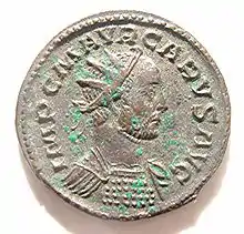 Lors de sa campagne contre les Perses, Probus avait fait l'erreur d'annoncer que des légions seraient dissoutes après le retour de la paix dans l'empire. Il n'en fallait pas moins pour que les légionnaires stationnés en Rhétie et en Norique se soulèvent et acclament leur propre général, Carus, comme empereur. Militaire de carrière et sénateur, Carus (Marcus Aurelius Carus, r. 282 – juil./aout 283) [35] était né à Narbo en Gaule et fut donc le premier de ce groupe d'empereurs à ne pas être originaire d'Illyrie. Les troupes de Pannonie, après avoir assassiné Probus, se rangèrent à ses côtés.