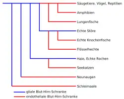 Tous les vertébrés vivant sur la Terre ont une barrière hémato-encéphalique, et presque tous montrent la barrière décrite en détail ci-dessus, où les jonctions serrées des cellules endothéliales apportent une contribution essentielle à l’effet de barrière. Ce n'est que dans le super-ordre des elasmobranchii, comprenant notamment les requins et les raies, et dans la famille des esturgeons vrais, que la barrière hémato-encéphalique est exercée par des astrocytes périvasculaires. On en déduit que quand, au cours de l'évolution, l'endothélium est devenu suffisamment étanche, il a pris le rôle de barrière. La barrière hémato-encéphalique gliale est donc considérée comme la forme primitive. Dans la famille des polypteridae et la sous-classe des dipneustes, la barrière hémato-encéphalique est réalisée par des jonctions serrées de l'épithélium. Par contre chez les vrais esturgeons elle est formée par une enveloppe complexe de cellules gliales, sans jonctions serrées visibles.
