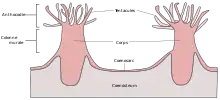 De haut en bas du corps du corail se trouve en premier lieu la cavité buccale servant l’ingestion et au rejet de matières biologiques. Au-dessous se trouve la cavité gastro-vasculaire qui permet la digestion des aliments. Autour de cette cavité se trouvent les mésentères.
