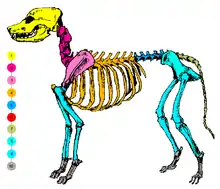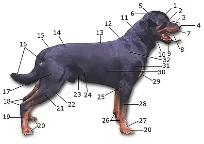 Le corps du chien est découpé en trois régions, l’avant-train (tête, encolure, membres antérieurs), le corps (dos, rein, cage thoracique, abdomen) et l’arrière-train (croupe, membres postérieurs, queue), régions elles-mêmes divisées en[2] :