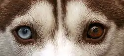 L'anatomie de l'œil du chien n’est pas très différente de celle de l’œil humain. La forme de l'œil est ronde ou en amande. La couleur de l'iris, déterminée par la présence d'un pigment, la mélanine, est généralement jaunâtre ou brunâtre (bleue chez certains huskys). Le pourcentage bâtonnets / cônes de la rétine est supérieur chez le chien par rapport à l'homme, ce qui lui donne une meilleure vision nocturne (favorisée en plus par le tapetum lucidum) mais une moins bonne perception des couleurs. Il est moins sensible aux détails du relief mais son champ visuel est 50 % supérieur à celui de l'homme. L'œil du chien est protégé par une membrane nictitante normalement pas visible, sauf en cas de mauvaise santé ou condition physique[12],[13].