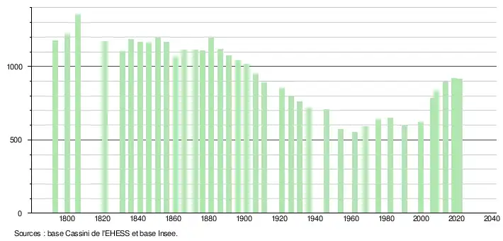 L'évolution du nombre d'habitants est connue à travers les recensements de la population effectués dans la commune depuis 1793. Pour les communes de moins de 10 000 habitants, une enquête de recensement portant sur toute la population est réalisée tous les cinq ans, les populations légales des années intermédiaires étant quant à elles estimées par interpolation ou extrapolation[23]. Pour la commune, le premier recensement exhaustif entrant dans le cadre du nouveau dispositif a été réalisé en 2008[24].