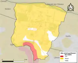 Le retrait-gonflement des sols argileux est susceptible d'engendrer des dommages importants aux bâtiments en cas d’alternance de périodes de sécheresse et de pluie. 92,9 % de la superficie communale est en aléa moyen ou fort (90,2 % au niveau départemental et 48,5 % au niveau national). Sur les 247 bâtiments dénombrés sur la commune en 2019, 234 sont en aléa moyen ou fort, soit 95 %, à comparer aux 91 % au niveau départemental et 54 % au niveau national. Une cartographie de l'exposition du territoire national au retrait gonflement des sols argileux est disponible sur le site du BRGM[27],[28].