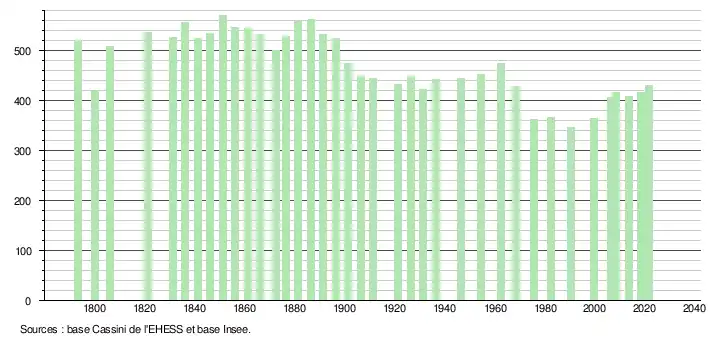 L'évolution du nombre d'habitants est connue à travers les recensements de la population effectués dans la commune depuis 1793. Pour les communes de moins de 10 000 habitants, une enquête de recensement portant sur toute la population est réalisée tous les cinq ans, les populations légales des années intermédiaires étant quant à elles estimées par interpolation ou extrapolation[33]. Pour la commune, le premier recensement exhaustif entrant dans le cadre du nouveau dispositif a été réalisé en 2008[34].