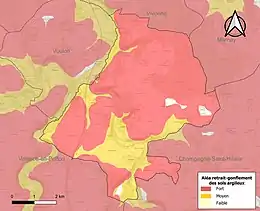 Les mouvements de terrains susceptibles de se produire sur la commune sont des affaissements et effondrements liés aux cavités souterraines (hors mines) et des tassements différentiels[19]. Afin de mieux appréhender le risque d’affaissement de terrain, un inventaire national permet de localiser les éventuelles cavités souterraines sur la commune[20]. Le retrait-gonflement des sols argileux est susceptible d'engendrer des dommages importants aux bâtiments en cas d’alternance de périodes de sécheresse et de pluie[21]. 98,7 % de la superficie communale est en aléa moyen ou fort (79,5 % au niveau départemental et 48,5 % au niveau national)[Carte 2]. Depuis le , en application de la loi ÉLAN, différentes contraintes s'imposent aux vendeurs, maîtres d'ouvrages ou constructeurs de biens situés dans une zone classée en aléa moyen ou fort[Note 3],[22].