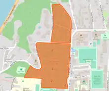 En orange, le cimetière ancien au nord, le cimetière nouveau au sud.
