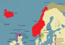 - La Norvège possédait aussi des colonies dans le sud du Groenland, non visibles ici.