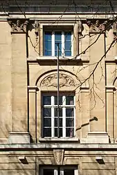 Les trois travées centrales sont plus ornées que les travées latérales. Les pilastres colossaux y sont surmontés chacun d'un chapiteau d'ordre composite[2] d'où émerge un mascaron figurant un visage de femme, et la décoration des fenêtres du premier étage y est plus soignée. Ces fenêtres sont encadrées de piédroits à imposte saillante supportant un arc en plein cintre dont le tympan est orné d'un cartouche orné de feuillages et de rubans. Les fenêtres des travées latérales, plus simples, sont surmontées de cartouches[3] marqués « Val St Lambert 1825 » et « Val St Lambert 1914 ».