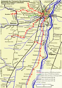 Au début de la Seconde Guerre mondiale, le , l'exploitation du service des voyageurs est suspendue avec l'évacuation des habitants de la ville. Le trafic reprend en août 1940 avec l'occupation allemande. En raison de la pénurie d'essence et de pneus, le tramway devient le seul réseau urbain disponible : il assure un trafic intense et transporte 71,5 millions de passagers en 1943[10]. L'exploitation de la ligne 1 vers le pont du Rhin reprend le . Le , elle est prolongée jusqu'à la gare de Kehl. Une extension jusqu'à la mairie de Kehl est également envisagée[11].