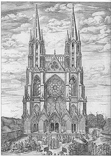 La façade nous est préservée par une gravure de Nicolas de Son de 1625. Cette gravure nous révèle une belle église gothique de couronnées d'ogives, dont la façade est ornée de deux tours jumelles autour d'un pignon triangulaire percé de trois oculi au-dessus d'une grande rosace, elle-même dominant deux fenêtres en ogive. Viollet-le-Duc compare ces deux tours-clochers à celles de la cathédrale, et admire leur solidité[15]