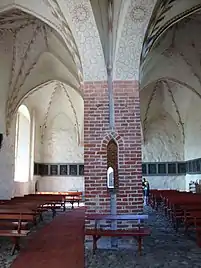 Le sol est pavé de pierres. Les peintures à la chaux des voûtes se composent de diverses boucles de feuilles et de motifs et de personnages primitifs. La chaire et les trois armoiries funéraires datent du XVIIe siècle[2].
