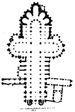 La nef s’élevait à 25 ou 27 mètres environ[14],[15], et le vaisseau central, qui avait réutilisé les fondations romanes, ne mesurait que 10 mètres de large[15].